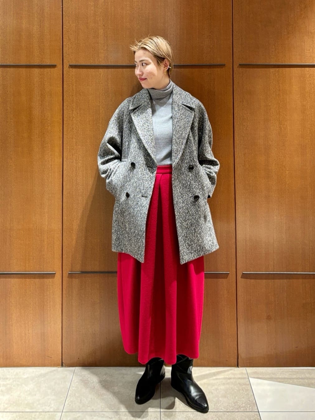 〈TOMORROWLAND collection〉ファンシーダイヤゴナル ショートコートは、しっかり厚みのある生地でも、包み込まれるような暖かさと軽さのあるアイテムです。 ラフにパッと羽織れる手軽さがあり、中に厚みのあるニットを着ても余裕のあるサイズ感。 シックなモノトーン配色は使い勝手がよく、テイスト問わず大人度を上げてくれます。 〈TOMORROWLAND collection〉リングニット バレルスカートは、生地の目が詰まった厚みのある生地なので秋冬通してタフに使えるアイテムです。 たっぷりしたタックが施されておりボディラインをカバーできるのも嬉しいポイント。 丈は長めなので下重心に見えないように足首を出したりヒールがある靴を履くと身長問わずバランスが取れると思います。