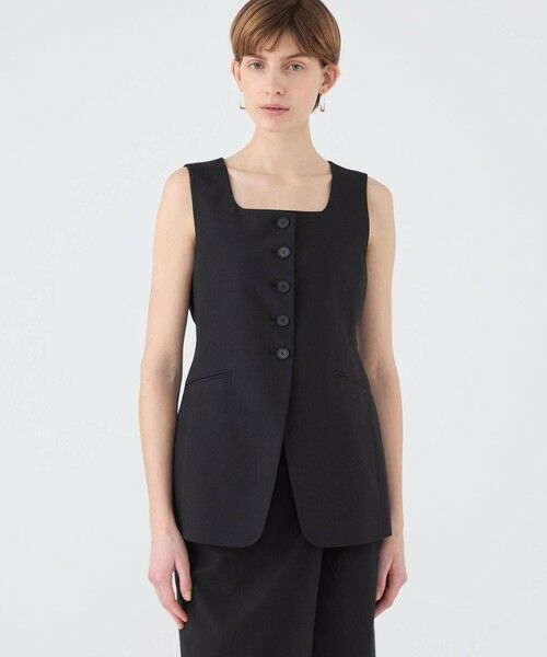 身長156㎝ 〈ポリエステルコットンリブ2-wayプルオーバー〉 透け感を気にせず程よいフィット感で着心地の良いニット。前後どちらでも着用でき着回し抜群のアイテムです。 〈ストレッチトロピカルハイウエストパンツ〉 ウールとポリエステルのミックス素材によりシワになりにくく軽やかな着心地のパンツ。 ハイウエストデザインでスタイルアップスタイリングが決まります。 〈ラメミックスストレッチスクエアネックジレ〉 ナチュラルな風合いにラメ糸をプラスした上品かつ清涼感のあるジレ。デコルテラインを美しく見せるデザインでカットソーやカジュアルアイテムとも合わせやすいです。