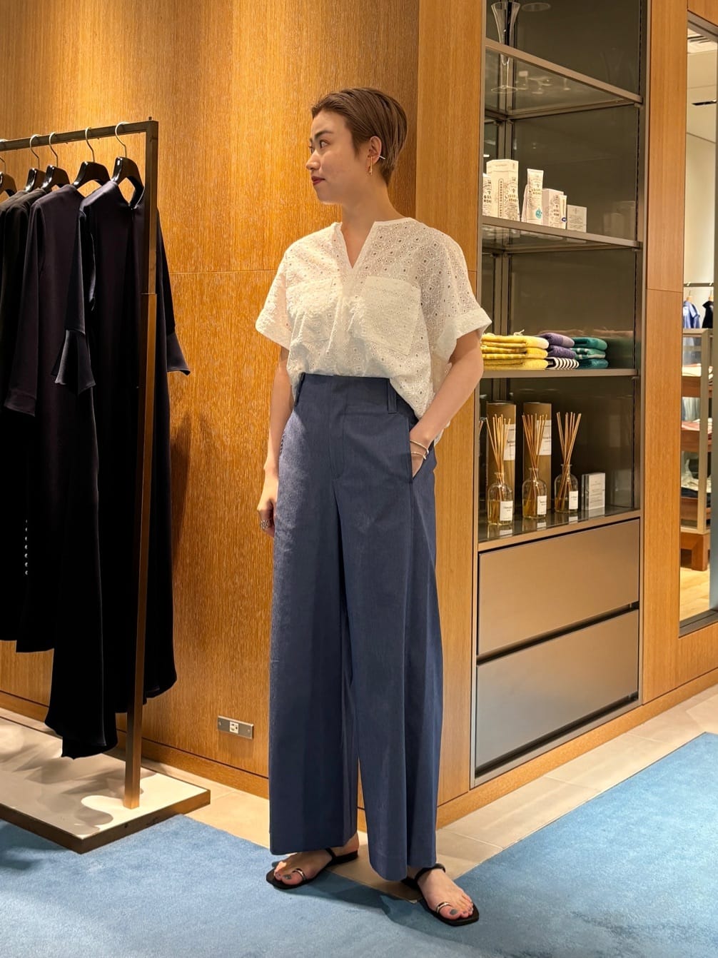 身長162㎝ シンプルな構成のスタイリングですが、素材の凹凸やカラーパンツを選んで無難になりすぎないように意識しました。 〈Ballsey〉ボイルスクエアエンブロイダリー パッチポケットブラウス 爽やかなコットン100%のスクエアモチーフエンブロイダリーレース素材を使用した見た目にも涼しいブラウス。 カジュアルなパッチポケットも、レース素材だとラフに傾きすぎず大人度をキープできます。 上半身の肉感を拾わないゆとりのあるフォルムで、体型身長問わず着こなせる万能アイテム。 合わせるボトムスによってウエストに入れたり出したりとバランス調整をしてみてください。 〈MACPHEE〉ナチュラルスラブストレッチ セミワイドパンツ サラッとした肌触りが心地よく、リネン独特な抜け感のある素材。高温多湿な夏を乗り越える相棒になってくれるアイテムです。 フォルムは至ってシンプルなセミワイドシルエット。後ろがゴム仕様になっており、しっかりホールド感があるのでウエスト周りは若干タイト目に感じました。 小柄で華奢な方でもトライしやすいパンツだと思います。 両脇にウエストの締め付けを調整できるアジャスターがついていますので、サイズを迷う方は好みのワイド幅と着丈で選んでいただくと良いと思います。