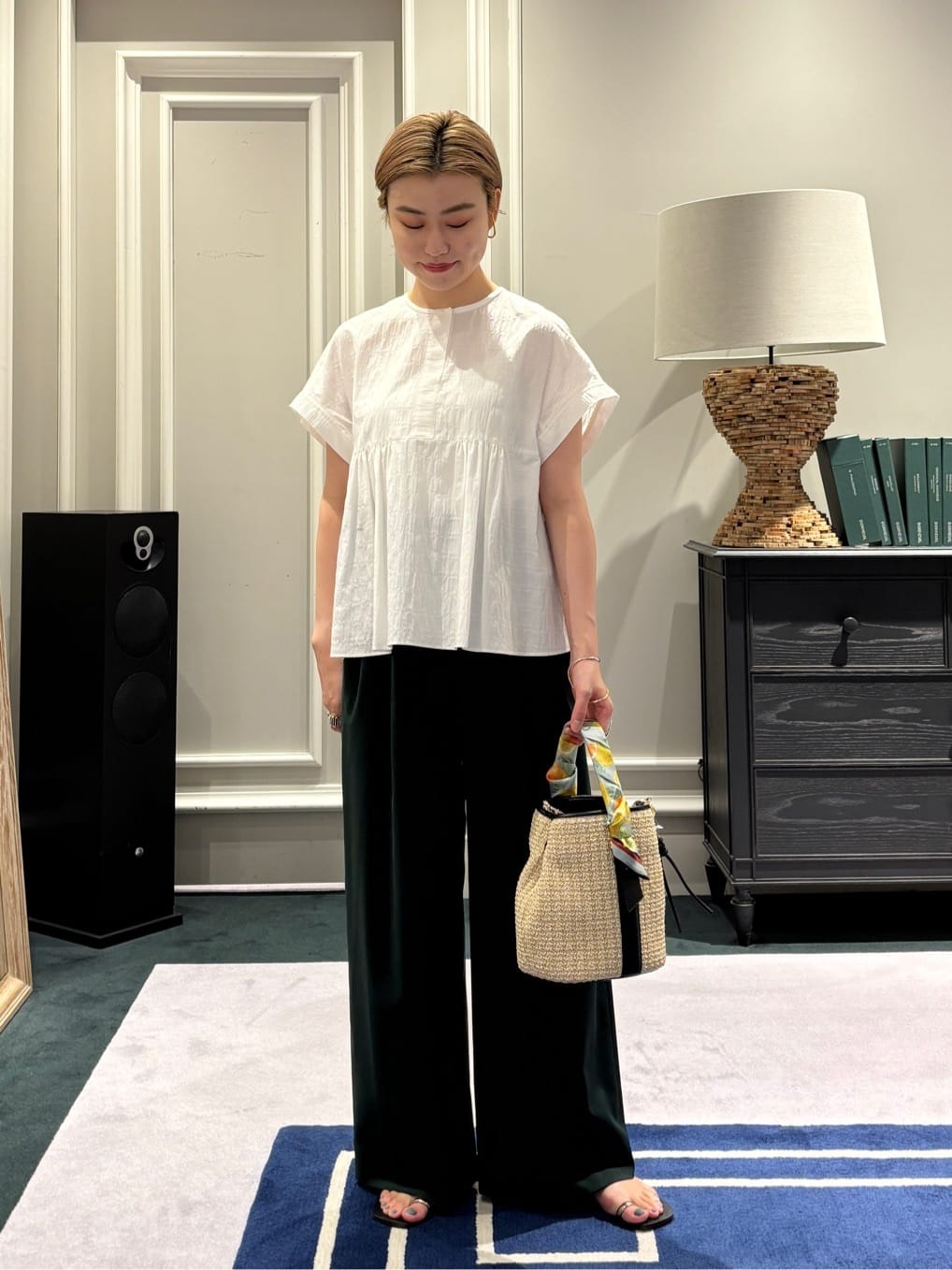 身長162㎝ Ballsey〉ボーダーサッカー サックブラウス 表面感のあるサッカー地を使用した、涼やかで軽やかなブラウスです。 ほんのり甘さを感じるギャザーの切り替えが立体感のあるシルエットを生み出し、 隠したいところは全部隠してくれる優秀デザイン。 ハリのある生地のお陰で、リラックスした着心地を保ちつつ、きちんと感もあるので、真夏のお出かけや通勤にもぴったりです。 ボトムはワイドパンツでラフに、細身パンツでシャープにまとめたりと、印象を変えて着回しできます。 〈Ballsey〉ポリエステルツイル2タックスラックスパンツ シンプルなデザインながら、穿くだけでぐっとこなれて見える優秀パンツ。 春夏秋と3シーズン着まわせる素材感なので、着る物に困った時に1本あると便利です。 腰まわりにもゆとりがあり、リラックス感のあるシルエットで、ウエストはややゆとりを持たせた設計になっています。 人によっては通常の着用サイズが大きく感じる方がいらっしゃいます。