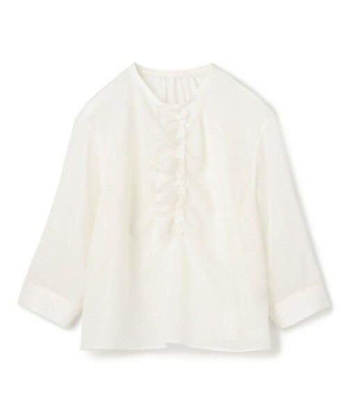 ウールとポリエステルの混紡糸を使用したボイル素材シリーズ。糸を強撚することでさらっとしたタッチとハリのある風合いに仕上げています。フリルブラウスはフロントに立体的なフリルをあしらったデザイン性のある一枚。ボクシーなシルエットで分量感がありつつも、コンパクトな着丈で軽やかに着こなしていただけます。7分袖なので残暑の厳しい時期から着用でき、カジュアルにもきれいめにも活躍してくれるアイテム。■素材情報厚み:薄手透け感:あり光沢:なし伸縮性:なし裏地:なし ※商品の色味は、商品単体または素材アップ画像をご確認ください2025AW商品店舗にお問い合わせの際は、下記の商品番号をお申し付けください。商品番号:12-01-54-01004