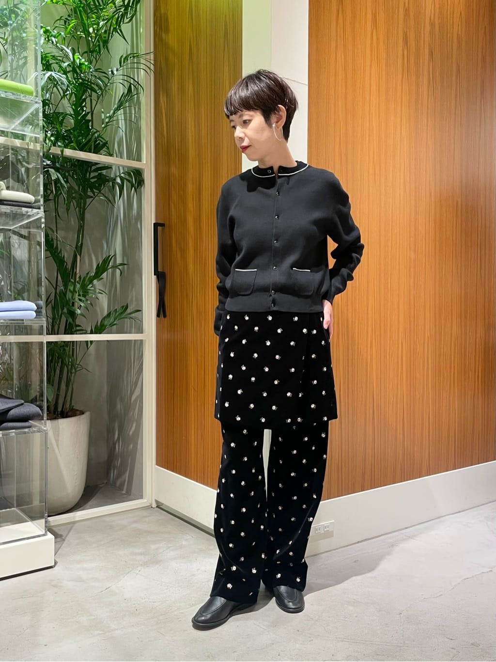 身長160㎝ CABaN定番のコットンカシミヤを使用したカーディガンは、首元とポケットにパールが施されており、1枚で上品な印象に。 パンツにもスカートにも合わせやすい着丈で様々なシーンで活躍します。