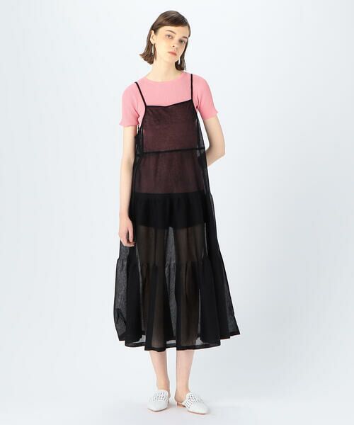 ワンピースは切り替え位置にギャザーを寄せたティアードデザインに華奢なストラップでフェミニンな印象の一着。
