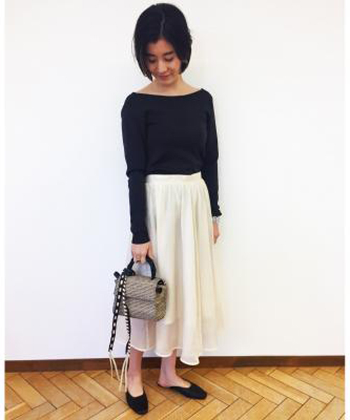 ミニマルなプルオーバー×フレアスカートでエレガントなシルエットに。 ネックラインや足下から素肌を覗かせてヘルシーな雰囲気をプラスしました。 ほど良い抜け感を演出してくれるスリッパサンダルがポイント!