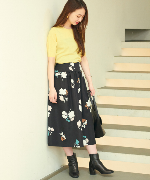 エレガントな中にもほど良い甘さのあるコーディネート。 トップスとボトムスの絶妙なバランスでスタイルアップ効果も! ブーツで足下の露出を抑え、秋のテイストをさりげなく取り入れました。