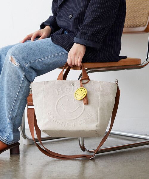 フロントにあしらったスマイルのエンボスはさりげない愛らしさ漂わせ、カラーを効かせたモチーフ付きのタッセルレザーチャームが目を惹くアクセントに。