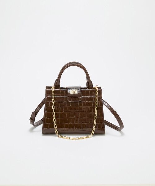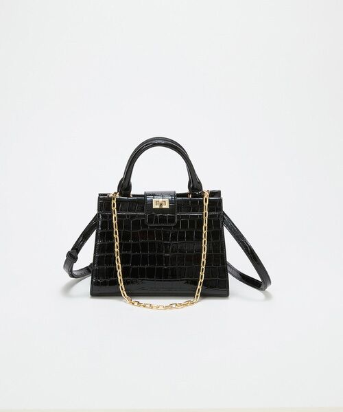 レディーな雰囲気漂うハンドバッグ。光沢感のある合成皮革にクロコ型押しを施したラグジュアリーなデザイン。口は大きく開き、内装は2部屋構造でファスナーポケットとオープンポケットも装備した整理上手なつくり。取り外し可能なショルダーベルトとチェーンベルト付きで、手持ち用ハンドルは中に入れ込むこともできるので気分やスタイルに合わせてお好みの持ち方を楽しめます。大人の装いに似合うブラックとブラウンの2色をラインナップ。 ※商品画像はサンプルのため、色味やサイズ、仕様等に変更が生じる場合がございますので、予めご了承ください。