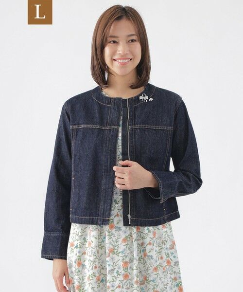 【L】【ウォッシャブル】ブレンドデニムノーカラーブルゾンこちらの商品はラージサイズです。ノーカラーできれいめに仕上げたデニムブルゾントレンド感のあるデニムをノーカラーできれいめに仕上げたブルゾンです。前は金属ファスナー開きになっています。ノーカラーですっきりとしたデザインなので、ワンピースなどエレガントなスタイルにも合わせていただけます。袖口はリターンアップできる仕様になっています。綿の芯糸にセルロースファイバーを溶け込ませて、セルロースのしなやかさを出したデニムです。オーセンティックな綿のスラブに滑らかさを融合させ、柔らかくコシのあるデニムに仕上げています。ラージサイズならではの悩みに応えるパターンメイキングで、すっきりと着ていただけます。■44サイズ→13号、46サイズ→15号が目安です。【着用推奨シーズン】オールシーズン