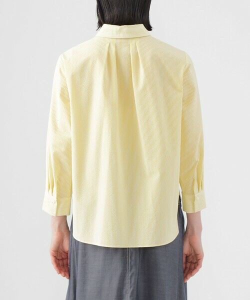 襟もとのタックが立体的なシルエットを保ち、お顔まわりを華やかにみせてくれるデザインシャツブラウスです。袖は7分袖なので、春はジャケットのインナーやニットとのレイヤードスタイル、真夏は1枚着や日除けの羽織りシャツ、と着回しに大活躍する便利アイテムです。