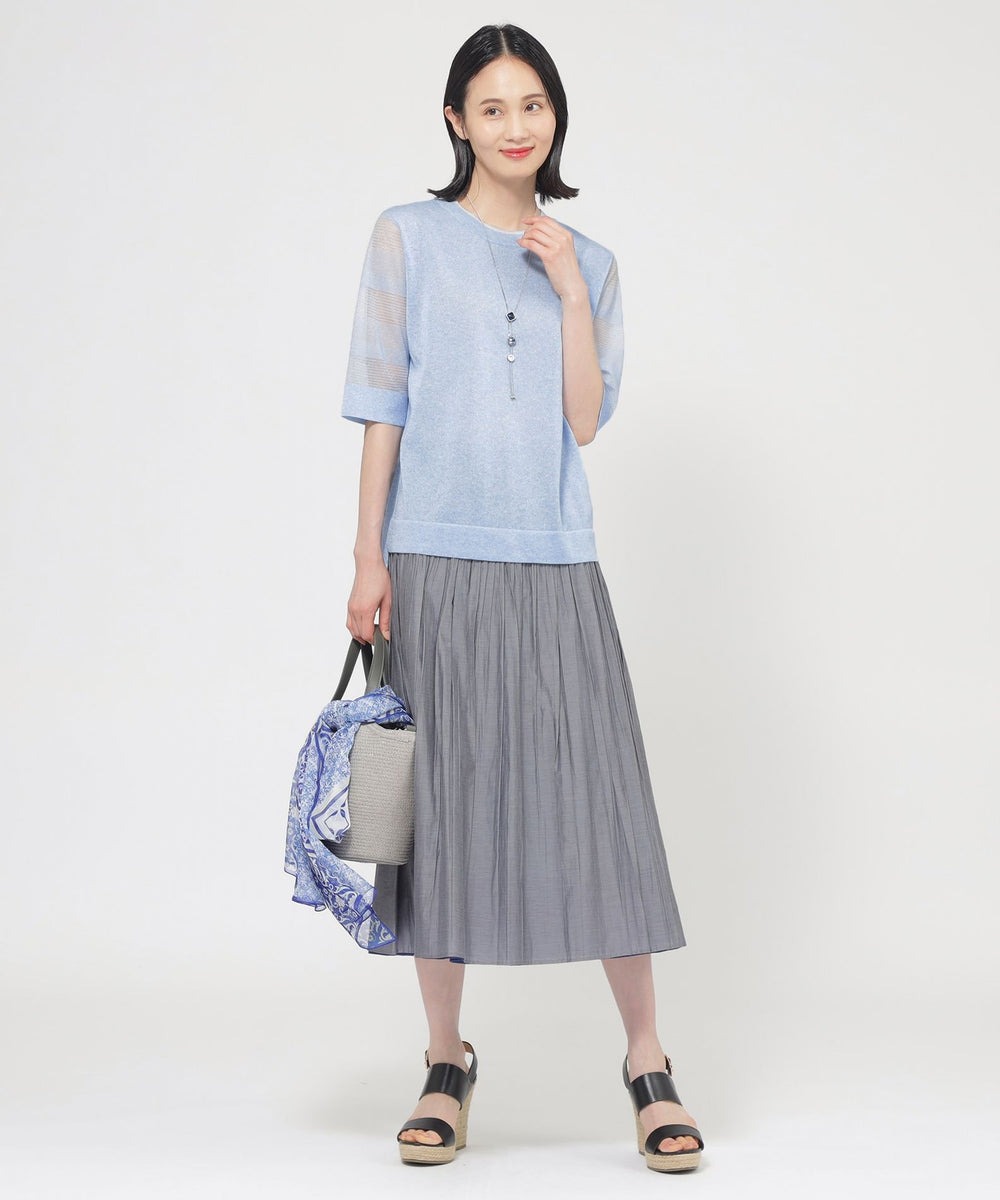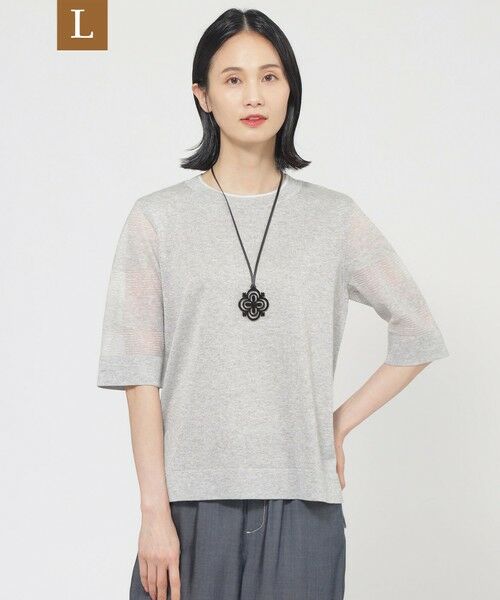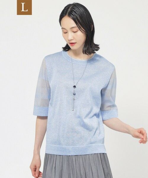 【L】【ウォッシャブル】ルレックスシアークルーネックニットこちらの商品はラージサイズです。軽やかで涼しげな印象のプルオーバーです。身頃はプレーンな天竺組織です。肌に触れる側はシャリ感の少ない綿ナイロンなので快適な着心地です。袖は透明糸を使用したシアーなボーダー組織で、テクニカルでニットらしい表現になっています。光沢と独特の発色が特徴のポリエステルを使用し、程よい風合いと透け感が特徴です。ラージサイズならではの悩みに応えるパターンメイキングで、すっきりと着て頂けます。■44サイズ→13号、46サイズ→15号が目安です。【着用推奨シーズン】春〜秋