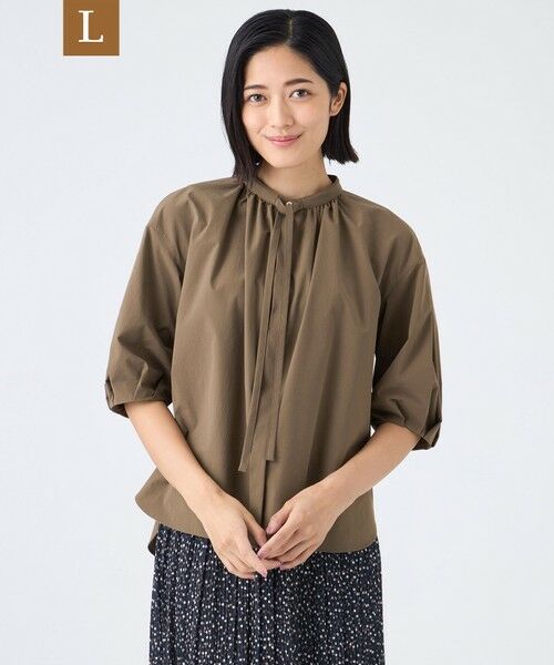 襟元のギャザーが華やかさを添え、お顔まわりを明るい印象にしてくれます。肘が隠れる丈のパフスリーブで上品な印象に仕上げています。裾はラウンドカットで、パンツにもスカートにもバランスよく合わせられるデザインです。