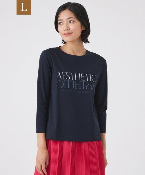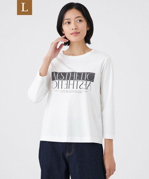 【L】【ウォッシャブル】コーコランバイオスムースプリントTシャツこちらの商品はラージサイズです。上品なで光沢のある素材のプリントTシャツです。プリントの『AESTHETIC』は「美意識」や「審美眼」という意味です。袖丈は8分袖で、長い期間ご愛用いただけるTシャツです。生地に光沢があり発色が良いため、顔色を明るく見せてくれます。イタリアのシャツ生地メーカー、アルビニ社が生産するアメリカ・コーコラン産の均一で繊細な綿花を使用し、コンパクト紡績した糸を使っています。高品質で発色が良く、細番手の糸をハイゲージで編み上げました。さらに、シルケット加工とバイオ加工で毛羽を抑え、滑らかで美しい光沢のあるスムース編みのジャージ素材です。アームホールには抗菌・消臭テープを附属しています。ラージサイズならではの悩みに応えるパターンメイキングで、すっきりと着ていただけます。■44サイズ→13号、46サイズ→15号が目安です。【着用推奨シーズン】春〜秋
