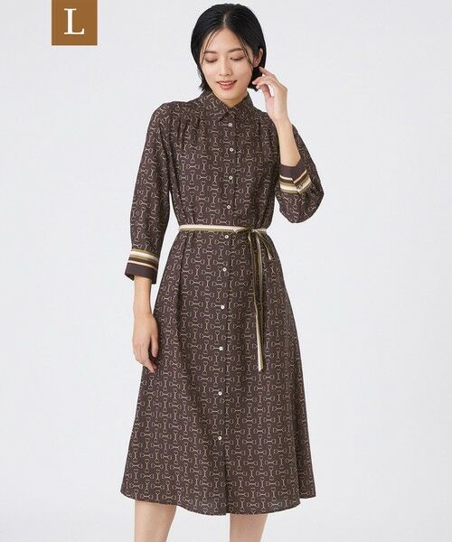 【L】【ウォッシャブル】ビットプリントデシンワンピースこちらの商品はラージサイズです。上品なプリントをあしらったワンピースです。カフスとリボンベルトのボーダー柄がアクセントです。暑い時期でもさらっと着用していただける素材です。クラシカルなビット柄にアクセントカラーを配色したプリント素材です。ボーダー柄をコンビ使いしています。軽やかな風合いのポリエステルデシンを使用しています。アームホールには抗菌・消臭テープを附属しています。ラージサイズならではの悩みに応えるパターンメイキングで、すっきりと着ていただけます。■44サイズ→13号、46サイズ→15号が目安です。【着用推奨シーズン】オールシーズン