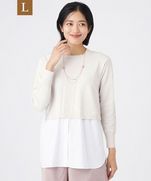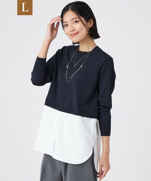 ニットは胸下丈で設定し、目線が上がりスタイルアップ効果を期待できます。シャツ部分は軽やかな落ち感のある素材で、お手入れも楽です。