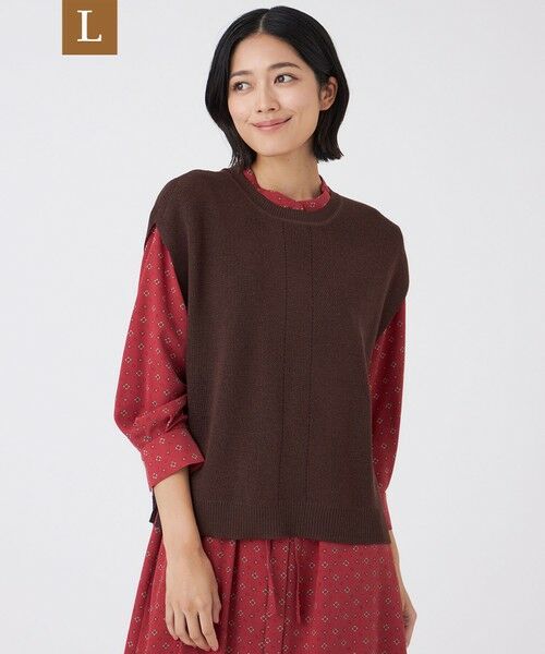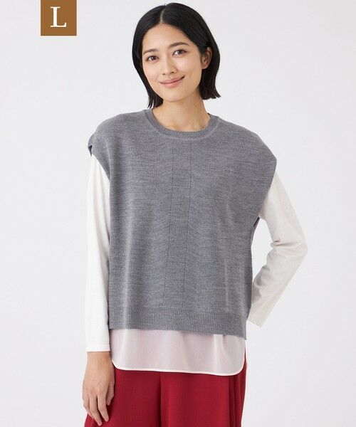 【L】【ウォッシャブル】エクストラファインウールジレこちらの商品はラージサイズです。シャツやカットソーとレイヤードスタイルがおすすめのニットジレです。たっぷりとしたドロップショルダーから自然にシェイプさせたコクーンフォルムに編み上げています。程良くフィットするリブの裾には両脇にスリットを施し、腰回りをスッキリと見せます。別付けのハイネックのリブ襟や、エポレット風の肩の編み柄や、フロントセンターの斜めの編み柄など、ニットを単調に見せない工夫を凝らしています。細くてしなやかなエクストラファインウールを使用しています。なめらかな風合いと綺麗なツヤ感があり、肌触りよく高級感のある素材です。ラージサイズならではの悩みに応えるパターンメイキングで、すっきりと着ていただけます。■44サイズ→13号、46サイズ→15号が目安です。【着用推奨シーズン】秋〜冬