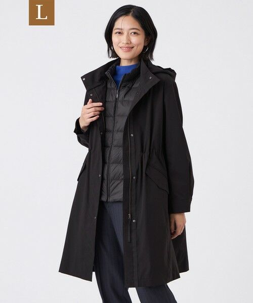 【L】ラミネートクロスコートこちらの商品はラージサイズです。取り外し可能なインナーのダウンベスト付きのアウターです。アウターとインナーベストの2層構造です。インナーベストのみ、アウターのみ、2枚をレイヤードして着用可能なマルチWAY仕様で、長いシーズン着用していただけます。表地は防風機能のある素材を使用しています。撥水性があるので汚れが付きにくいメリットもあります。インナーダウンは洗っていただけます。裏側に薄いラミネートフィルムを貼ったタフタ素材です。適度なハリがあって、アウターのフォルムを綺麗に出しています。ラージサイズならではの悩みに応えるパターンメイキングで、すっきりと着ていただけます。■44サイズ→13号、46サイズ→15号が目安です。アームホールには抗菌・消臭テープを附属しています。【着用推奨シーズン】冬