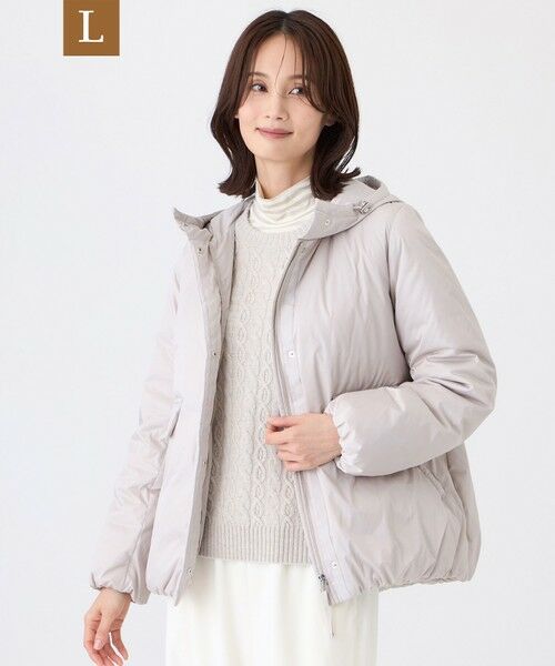 【L】【グリーンダウン】ソフトサテンダウンこちらの商品はラージサイズです。グリーンダウンを使用したフード付きのダウンです。着丈に前後差があるので、スカートともバランス良くコーディネートして頂けます。後ろの着丈が長く、暖かさをキープします。袖口と裾にゴムを入れて、少しバルーン風のシルエットにしています。寒さが続く春先まで着用していただける春カラーのライトグレーとベーシックなダークネイビーの2色展開です。サテン組織のため適度な光沢感があり、発色の綺麗さが特徴です。表の滑らかなタッチはそのままで、裏側から生地にハリをもたせる加工をし、仕立て映えのするアウター素材です。ラージサイズならではの悩みに応えるパターンメイキングで、すっきりと着ていただけます。■44サイズ→13号、46サイズ→15号が目安です。【着用推奨シーズン】秋〜春