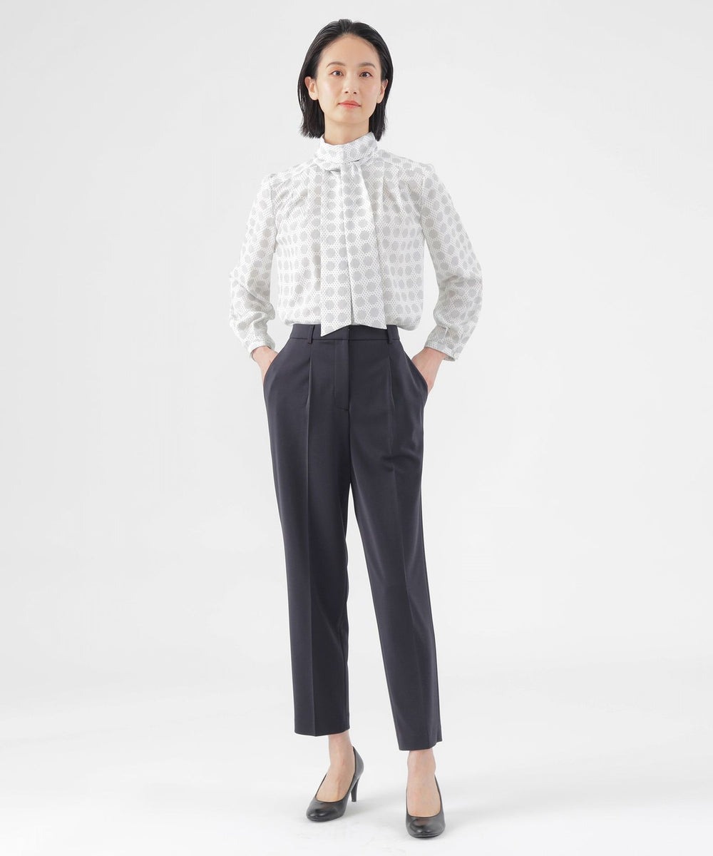 【トップス】取り外し可能なリボン付き。お顔を明るくみせてくれるオフホワイトとピンクの2色展開です。シンプルながら立体感と奥行を感じさせるクラシカルで上品なドット柄。 【パンツ】脚をきれいにみせてくれるセンタープレス。後ろウエストはゴム仕様になっており、着心地良く仕上げています。