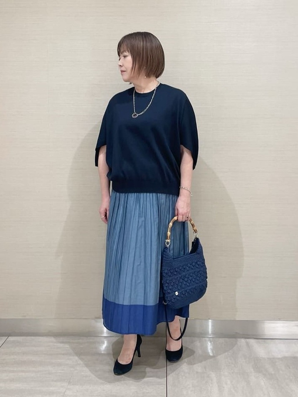 こんにちは♪ これからが夏本番ですね。ニットは体にフィットせず風が通って◎ ワンサイズ展開ですが11号の私でもゆとりがあります。スカートはリバーシブルで着回しが効きます。【モデル身長:159cm】