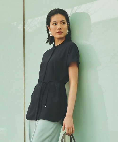 フレンチスリーブのバンドカラーブラウスです。程よく抜け感を演出するややゆとりのあるシルエットです。前開きデザインで羽織りとしても着用していただけます。ウエストリボンは取り外し可能で、ウエストのシルエットをお好みでアレンジできます。