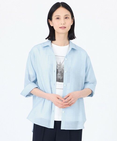 襟にワイヤーが入った7分袖シャツです。首元に立体感を出せるデザインで、袖口のスリットにより袖丈の調整も可能です。一枚で着るのはもちろん、羽織りとしてもお使いいただける便利な一着です。