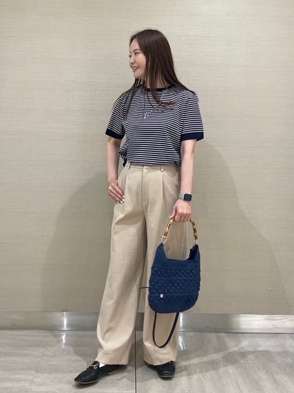 ネイビーボーダー×ベージュのキレイめカジュアルコーデ。カットソーよりも高見えするニットTシャツは着心地の良さに感動。ネイビー系のボーダーなら下着の透けも気にならずお召しいただけます。合わせたタックワイドパンツも接触冷感、透け防止と嬉しい機能付き。どちらもヘビロテ間違いなしです♪【モデル身長:162cm】