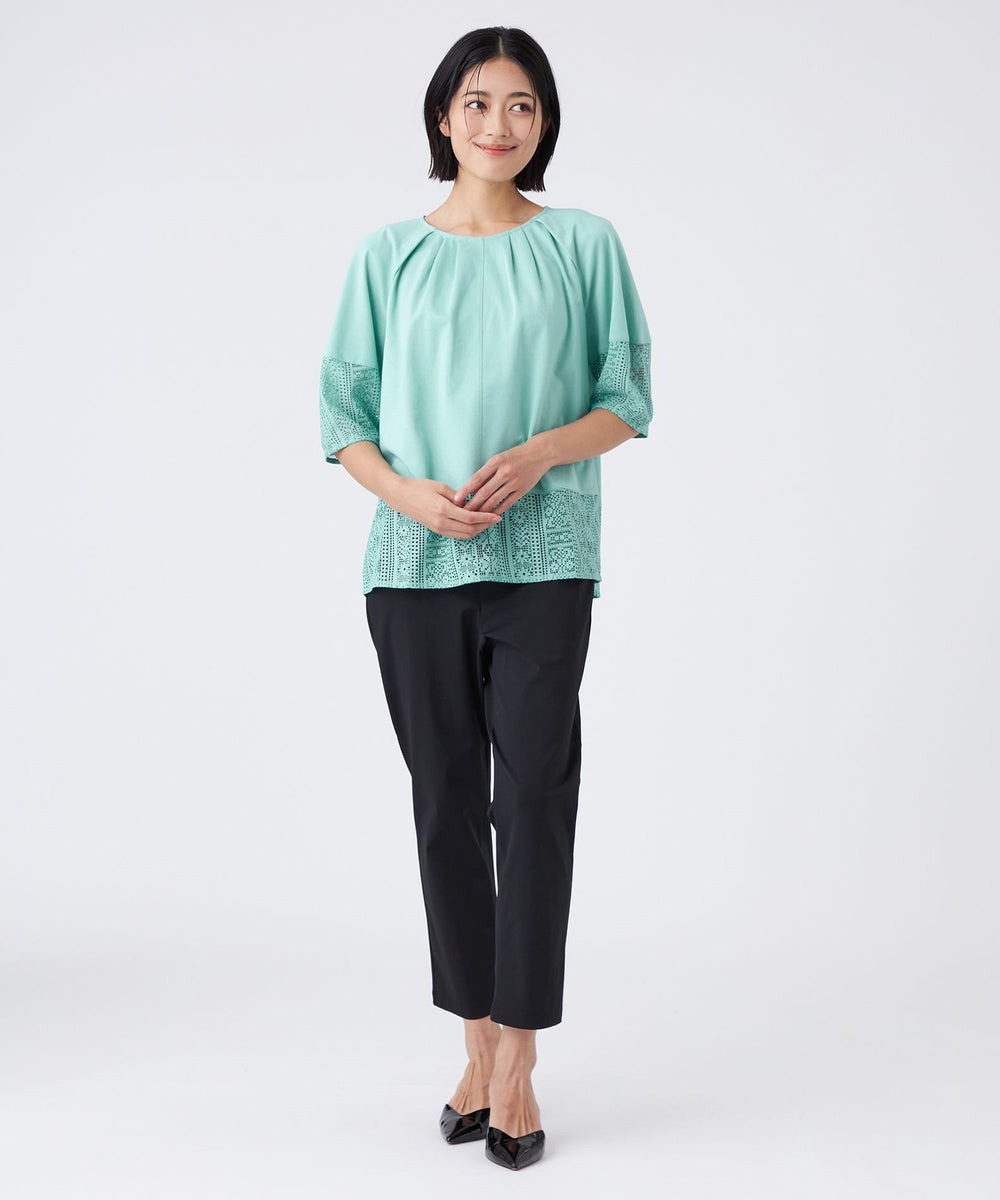 さらっとした素材感で、一枚で着映えるレースコンビのカットソーです。透け感のあるレース切り替えがアクセントになった、異素材ミックスのプルオーバーです。ふんわりとした袖のシルエットと、襟まわりに施したタックデザインが、立体的で構築的なフォルムを生み出しています。