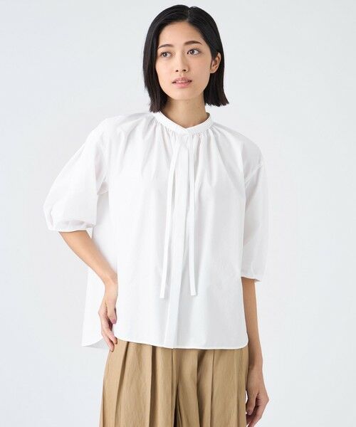 襟元のギャザーが華やかさを添え、お顔まわりを明るい印象にしてくれます。肘が隠れる丈のパフスリーブで上品な印象に仕上げています。裾はラウンドカットで、パンツにもスカートにもバランスよく合わせられるデザインです。