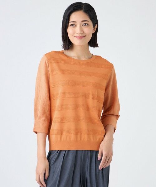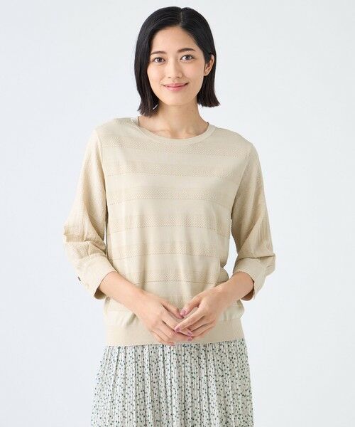 【ウォッシャブル】ビスコースナイロンニット一枚で着映える意匠性の高いプルオーバーです。ブラウスのように着られる布帛とニットのコンビプルオーバーです。袖にはナチュラルストレッチのドビー生地を使用し、動きやすい点が特徴です。身頃部分は透けにくく、レーシー編みをボーダー調にアレンジしてデザイン性を高めています。長繊維のビスコースとストレッチ性のあるナイロンを撚り合わせた素材です。目が詰まった美しい編地で、肌離れが良く適度な清涼感があるため、長いシーズン快適にお使いいただけます。袖部分には、スモッキングやシャーリング風のこだわりドビー素材を使用し、ニットのような膨らみと自然な伸縮性が特徴です。【着用推奨シーズン】春〜秋