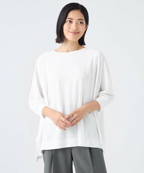 モモンガ風のゆったりとしたシルエットが特徴のドルマンプルオーバーです。たっぷりとした身頃と袖でリラックス感があり、腰回りや二の腕など気になる部分を自然にカバーします。袖口はたくし上げて長さを調整でき、抜け感のあるサイドスリットも魅力です。