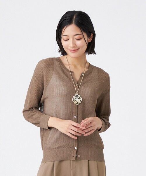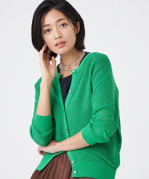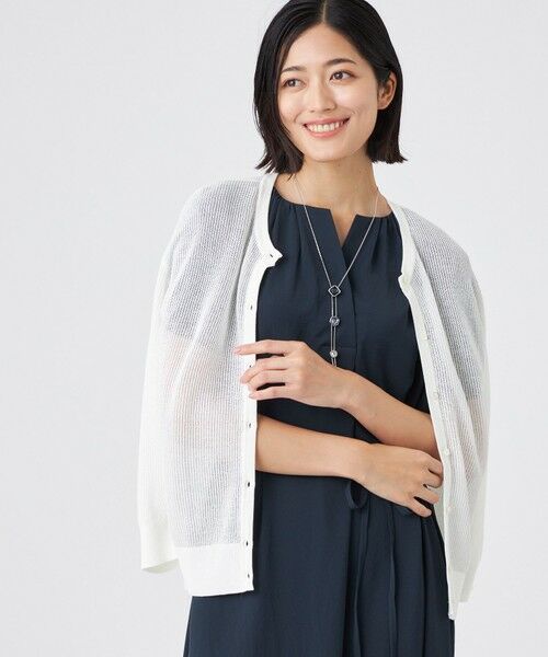 【ウォッシャブル】2WAYメッシュカーデ前後2WAYで着こなしが楽しめるカーディガンです。細かなメッシュ柄が特徴です。ドロップショルダーと程よい袖幅でTシャツの上にも重ねやすく、着回し力の高い一枚です。ドレープ感のあるレーヨンと柔らかな綿をブレンドした快適なコンフォートヤーンを使用しています。クリアなラメにスパークナイロンを重ねた極細糸を組み合わせることで、カジュアルすぎず柔らかさと華やかさを兼ね備えた仕上がりになっています。【着用推奨シーズン】夏