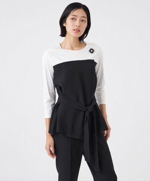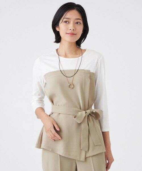 【ウォッシャブル】ドライダブルクロス×スムースコンビカットソー幅広いシーンで活躍する一枚で着映えるカットソーです。トレンドのビスチェを重ね着したように見える異素材コンビのプルオーバーです。ウエストから裾にかけて広がるすっきりとしたAラインシルエットで、コンパクトなサイズ感はジャケットのインナーとしても最適です。ウエストリボンは取り外し可能で、さまざまなスタイリングをお楽しみいただけます。同素材のパンツ(U1R03-643)とのセットアップスタイルもおすすめです。布帛部分は、ドライな肌ざわりと高いストレッチ性を持つ糸を使用したダブルクロス素材です。色の発色が美しく、ほどよいハリ感があり、仕立て映えする上品な風合いが魅力です。カットソー部分は、セルロース繊維と綿を使った、なめらかなスムース素材です。細番手の糸を使用し、アクアレジェンド加工を施すことで、お手入れがしやすくデイリーに使える仕上がりになっています。アームホールには抗菌・消臭テープを附属しています。【着用推奨シーズン】春〜秋