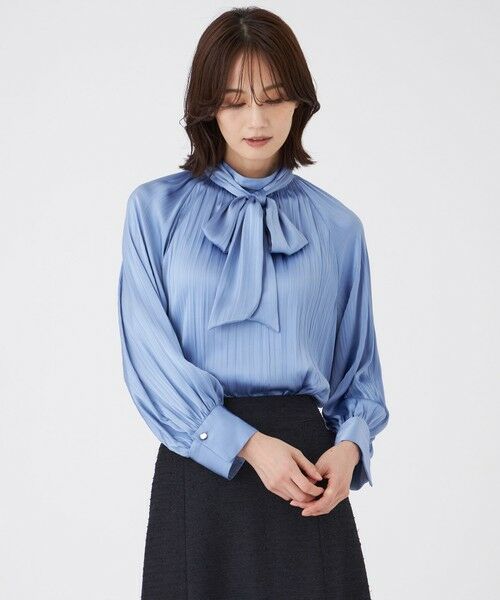 【ウォッシャブル】プリーツサテンブラウススタンドカラーのボウタイ付きギャザーブラウスです。襟まわり、袖口にたっぷりとギャザーを入れ、一枚で着映えする華やかなアイテムです。タイは結び方を変えたり、取り外してスタンドカラーで着用していただけたりと、アレンジ可能です。サテン素材で、ランダムプリーツのような縦に流れる生地の表情と光沢のある質感、ドレープ性が特徴です。アームホールには抗菌・消臭テープを附属しています。【着用推奨シーズン】秋〜春