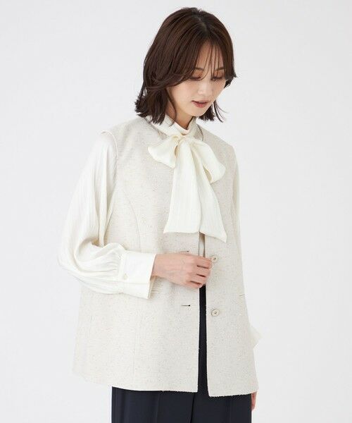 【ウォッシャブル】ペーパーヤーンファンシージレラメが上品で華やかな印象のジレです。見返しに別布グログランを使用して厚みの出ない仕様にしているので、コートのインナーとしても着用していただけます。レイヤードすることで体温調節にも便利で、比較的長いシーズン着用可能です。一見布帛のツィードのように見えるジャージ素材です。ジャージのため軽くてストレッチ性があり着心地が良いです。和紙を使用した意匠糸と表情感のあるノット糸がポイントです。さらに、さりげなく入っているラメにより、上品な光沢感のあるファンシー素材に仕上がっています。【着用推奨シーズン】秋〜春