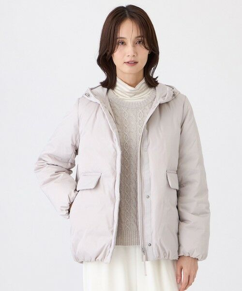 【グリーンダウン】ソフトサテンダウングリーンダウンを使用したフード付きのダウンです。着丈に前後差があるので、スカートともバランス良くコーディネートして頂けます。後ろの着丈が長く、暖かさをキープします。袖口と裾にゴムを入れて、少しバルーン風のシルエットにしています。寒さが続く春先まで着用していただける春カラーのライトグレーとベーシックなダークネイビーの2色展開です。サテン組織のため適度な光沢感があり、発色の綺麗さが特徴です。表の滑らかなタッチはそのままで、裏側から生地にハリをもたせる加工をし、仕立て映えのするアウター素材です。【着用推奨シーズン】秋〜春
