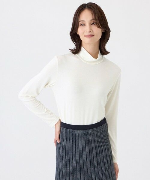【ウォッシャブル・吸湿発熱】サクラウォームベア天カットソーベーシックスタンドカラーのインナーカットソーです。マシュマロのような気持ちの良い肌触りです。裾がシャツテールになってるので1枚でも決まりますが、ジレやニットプルオーバーとレイヤードしたコーディネートもおすすめです。特殊な方法で紡績された毛羽立ちにくいレーヨン紡績糸を使用したベア天です。薄手ながら吸湿発熱性があり、初秋〜梅春まで長いシーズン着用していただけます。着心地の良さにこだわり、程良いストレッチ性となめらかな肌触りです。アームホールには抗菌・消臭テープを附属しています。【着用推奨シーズン】秋〜春
