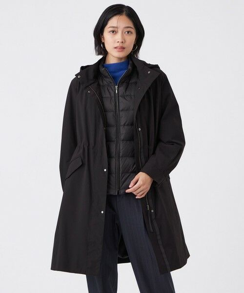 ラミネートクロスコート取り外し可能なインナーのダウンベスト付きのアウターです。アウターとインナーベストの2層構造です。インナーベストのみ、アウターのみ、2枚をレイヤードして着用可能なマルチWAY仕様で、長いシーズン着用していただけます。表地は防風機能のある素材を使用しています。撥水性があるので汚れが付きにくいメリットもあります。インナーダウンは洗っていただけます。裏側に薄いラミネートフィルムを貼ったタフタ素材です。適度なハリがあって、アウターのフォルムを綺麗に出しています。アームホールには抗菌・消臭テープを附属しています。【着用推奨シーズン】冬