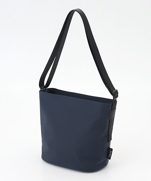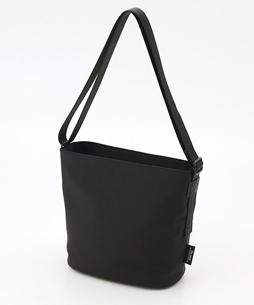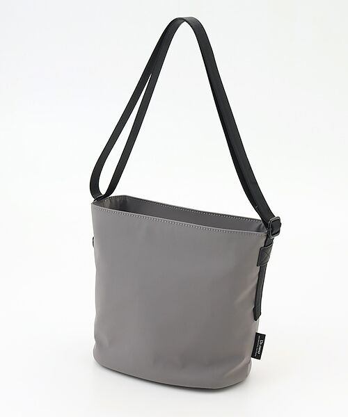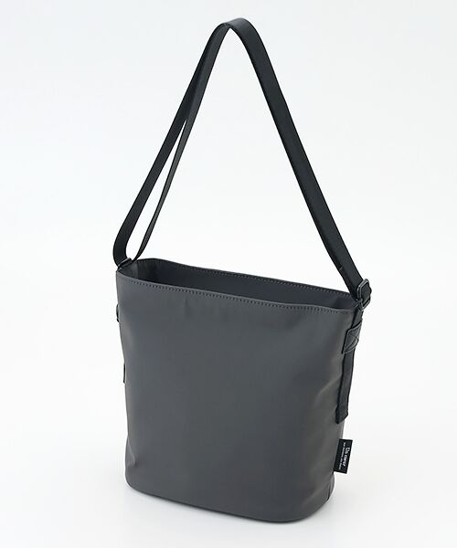 撥水加工が施されたマットな質感の生地を採用。生地を触った時のタッチ・シャリ感にもこだわりセレクトしました。立体感とシルエットを形作るためのハリ・コシを付与する加工もおこなっています。ミニマルバケッショルダーです。片方サイドに配置したDカンはキーホルダーやチャームをつけられるように配置、もちろん付けていなくてもデザインのポイントとなってくれます。500mlペットボトル、長財布も収納可能です。背面にはファスナーポケットを配置。■天ファスナー開閉 ■500mlペットボトル・長財布同時収納可能スペック