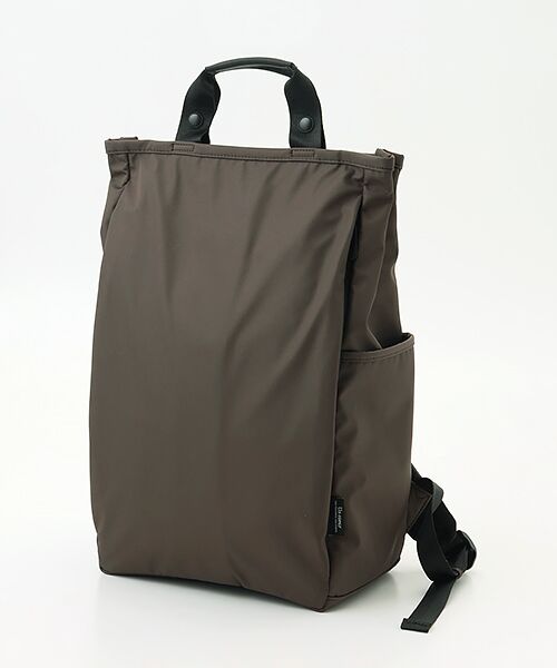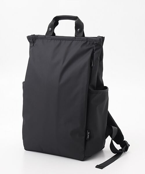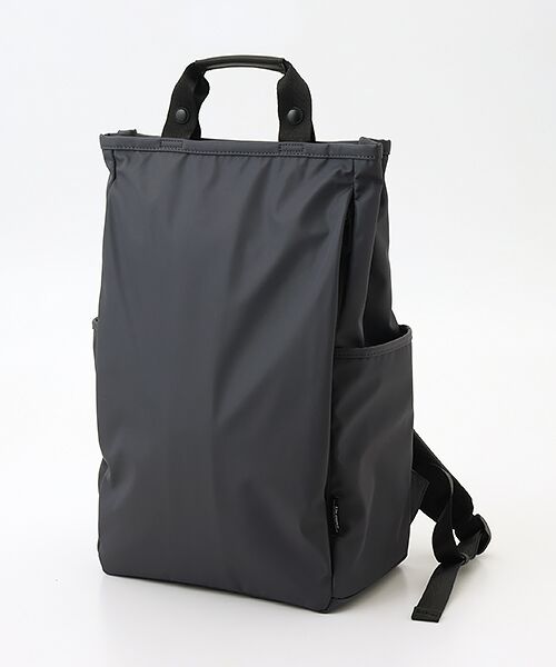 フロントにデザインされたポケットは長財布が入る大きさで、その他スマホやイヤホンの収納にもおすすめです。両サイドにはボトル・傘収納用のポケットを配置しており、背負ったまま出し入れが可能です。背面にはキャリーオン用のベルトも配置しています。シンプルデザイン、かつ大容量で機能的なので通勤通学にもオススメです。