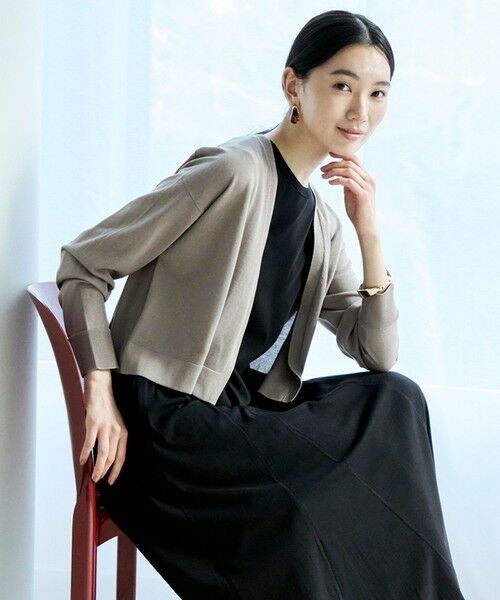 ■デザインボタンレスのクロップド丈カーディガン。ワンピースやカットソーの上から気軽に羽織れるので、気温が不安定な時期の温度調節にも最適な一枚です。接触冷感機能付きなので、暑い夏でも肌離れがよくサラッと羽織れます。