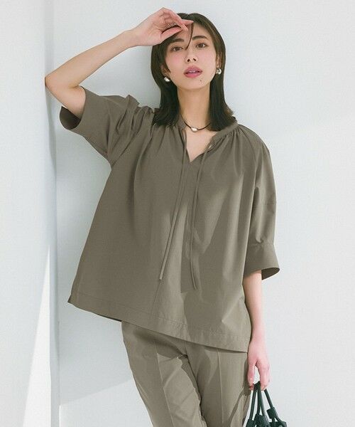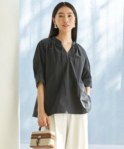 ■デザインボリュームのあるランタンスリーブが1枚で映えるデザインブラウス。甘めのデザインにスキッパー開きと広めのカフスで抜け感をプラス。機能素材ながら、きれいめのデザインなのでシーンを選ばず着用いただけます。
