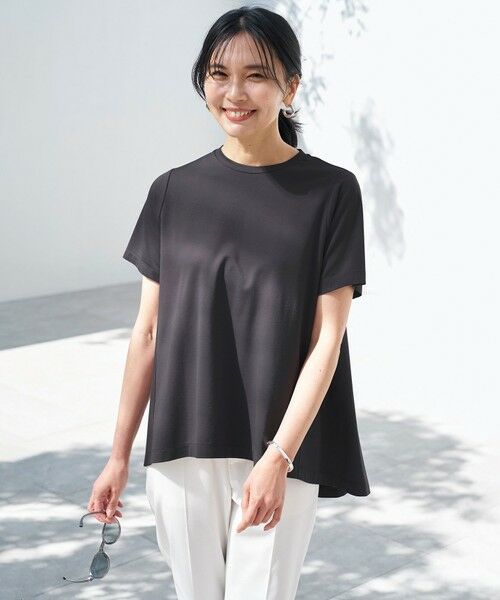 ■デザイン拘り抜いたフォルムで、美しいシルエットに。前身頃はスッキリと、後ろウエストから裾にかけてふんわり広がるシルエットが上品で軽やかなデザインです。少し長めの着丈間でヒップ回りにかけてしっかりとカバーしてくれます。後ろ中心のジップデザインは着脱もしやすく、繊細なリボンテープがポイントに。夏に嬉しい機能性を兼ね備え、快適に過ごしていただける機能美Tシャツです。