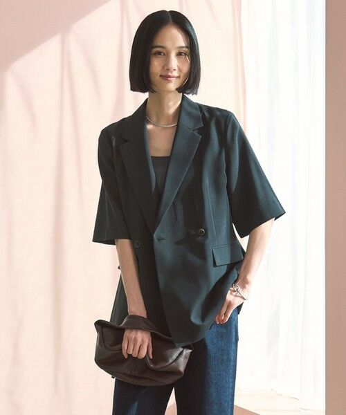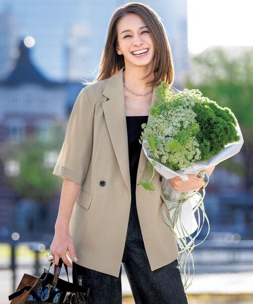 ■デザインリネンライクな素材が、見た目も着心地も涼しいハーフスリーブジャケット。ジャケットのきちんと感、シャツのような軽やかさを兼ね備えたデザインに仕上げました。リラックスしたシルエットなので、オンでもオフでも気負わず着られる1枚です。デイリーからオケージョンまで、合わせるアイテムやシーンを問わず着用いただけます。同素材のパンツやオールインワンとのセットアップもおすすめです。