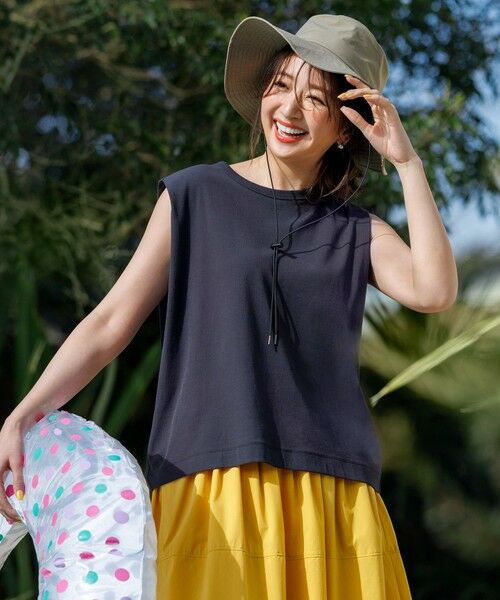 ■デザインサラサラとした強撚糸を使用した、フライス編みのノースリーブトップス。きちんと見えするネックラインや、肩先のダブルタックがポイントです。ノースリーブながら、肩先のタックがお袖をカバーしてくれます。もたつかない素材感なので、ウエストインでもアウトでも、ごわつかずにすっきりとした印象になります。ボトムを選ばずに着て頂ける万能アイテムです。1枚でも、カーデやシャツなどのインナーアイテムとしても活躍します。