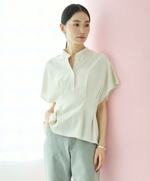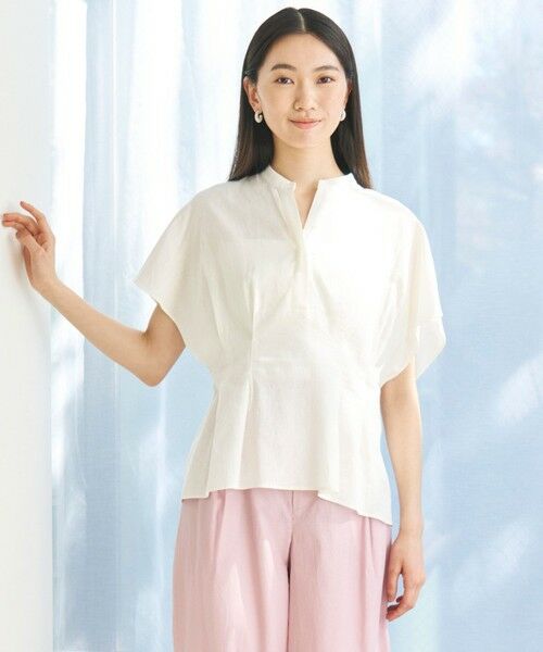 ■デザインさらりとした清涼感が嬉しい、リネン混素材のデザインブラウス。ウエストシェイプしたデザインがポイントで、気になる二の腕やおなか周りをさりげなくカバーしてくれます。身体から離れるゆったりしたシルエットで風を通すので、暑い時期にも快適な着心地です。カジュアルにデニムを合わせたスタイリングから、きれいめなワイドパンツ合わせまで幅広い着こなしを楽しめます。