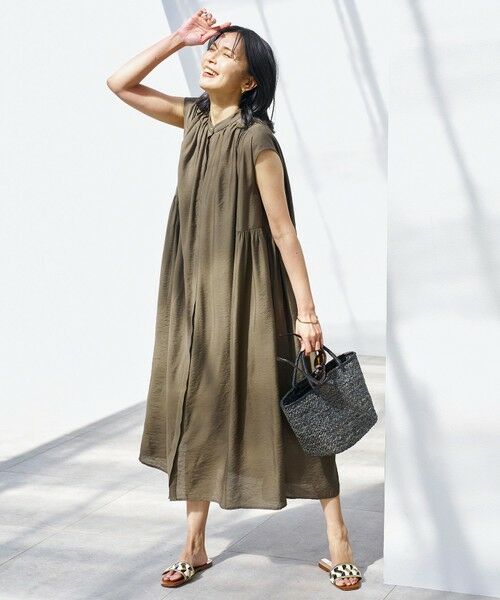 ■デザイン1枚で映えるギャザーたっぷりの華やかワンピース。バンドカラーときらっとしたボタンで、きちんと感がありながらゆったりとしたシルエットに。風を通しやすく、気温の高い季節にもぴったりです。一枚ではもちろん、前空きで着用してパンツ合わせのレイヤードスタイルもお楽しいただけます。(アンダードレス付き)