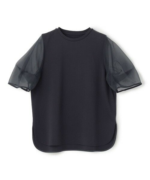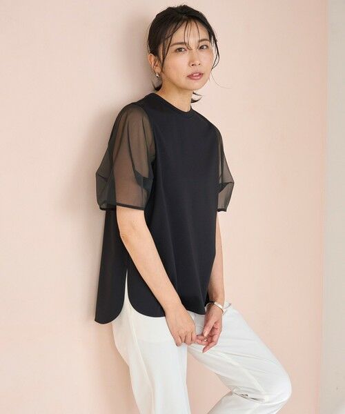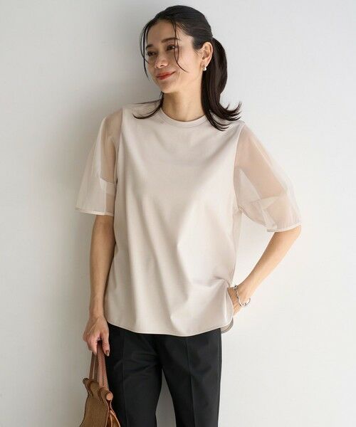 シアー素材で仕上げたフォルム感のあるタックスリーブが、涼しげでありながら二の腕のラインをしっかりカバーしてくれるデザインです。身頃はシャツテールデザインで、インせずに綺麗なスタイリングに仕上がります。袖の透け感が上品な印象を与えてくれるので、きれいめスタイリングとの相性も良いTシャツです。デニムなどのカジュアルボトムを合わせたスタイルも、品のある女性らしい印象をプラスできます。