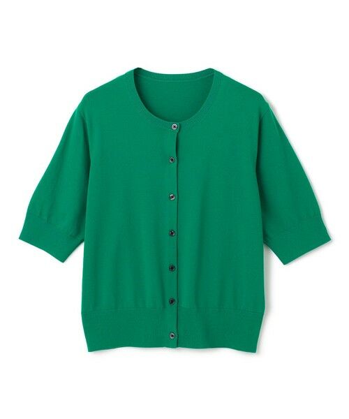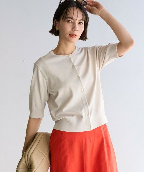 ■デザイン羽織りでも、プルオーバーでも着用できる、クルーネックの半袖カーディガン。5分袖で二の腕もしっかりカバーしてくれるので、夏の羽織りに最適です。クロップド丈なので、スカートとも合わせやすいデザイン。ワンピースの上にサッと羽織っても、バランスよく着こなせます。