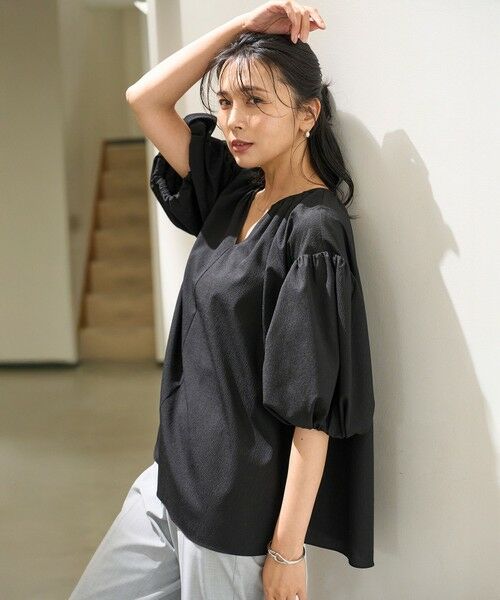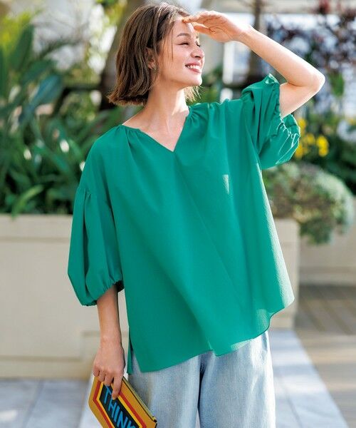 東レが開発した清涼快適素材を使用!ボトムを選ばずスタイリングを楽しめる!涼し気な首元が印象的なボリュームブラウス