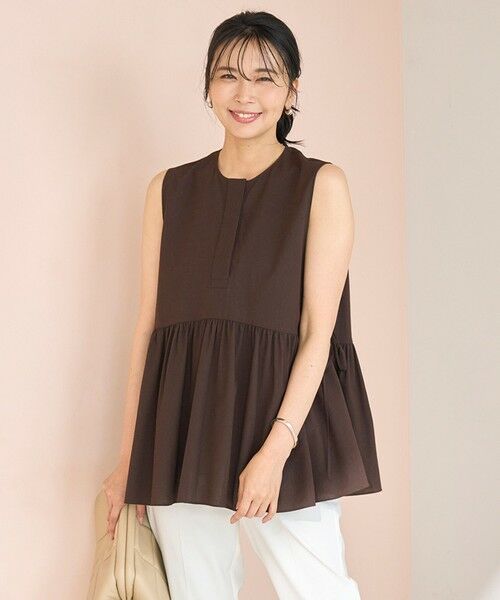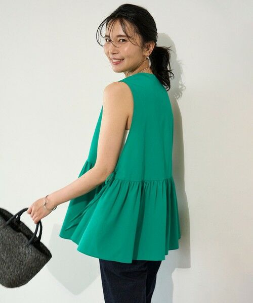 ■デザイン清涼感と女性らしさを両立したペプラムブラウス。大胆にあいた袖ぐりが肩回りをスッキリ見せる、通気性に優れたデザインです。キャミソールなどのインナーを合わせた、レイヤードスタイルをお楽しみ頂けます。軽やかな素材と、ふんわり広がるペプラムシルエットが魅力の一枚。シンプルながらも華やかさを感じさせるデザインで、暑い季節でも快適におしゃれを楽しめます。デニムを合わせた爽やかな着こなしや、スラックスやIラインスカートを組み合わせたキレイめコーデもおすすめです。